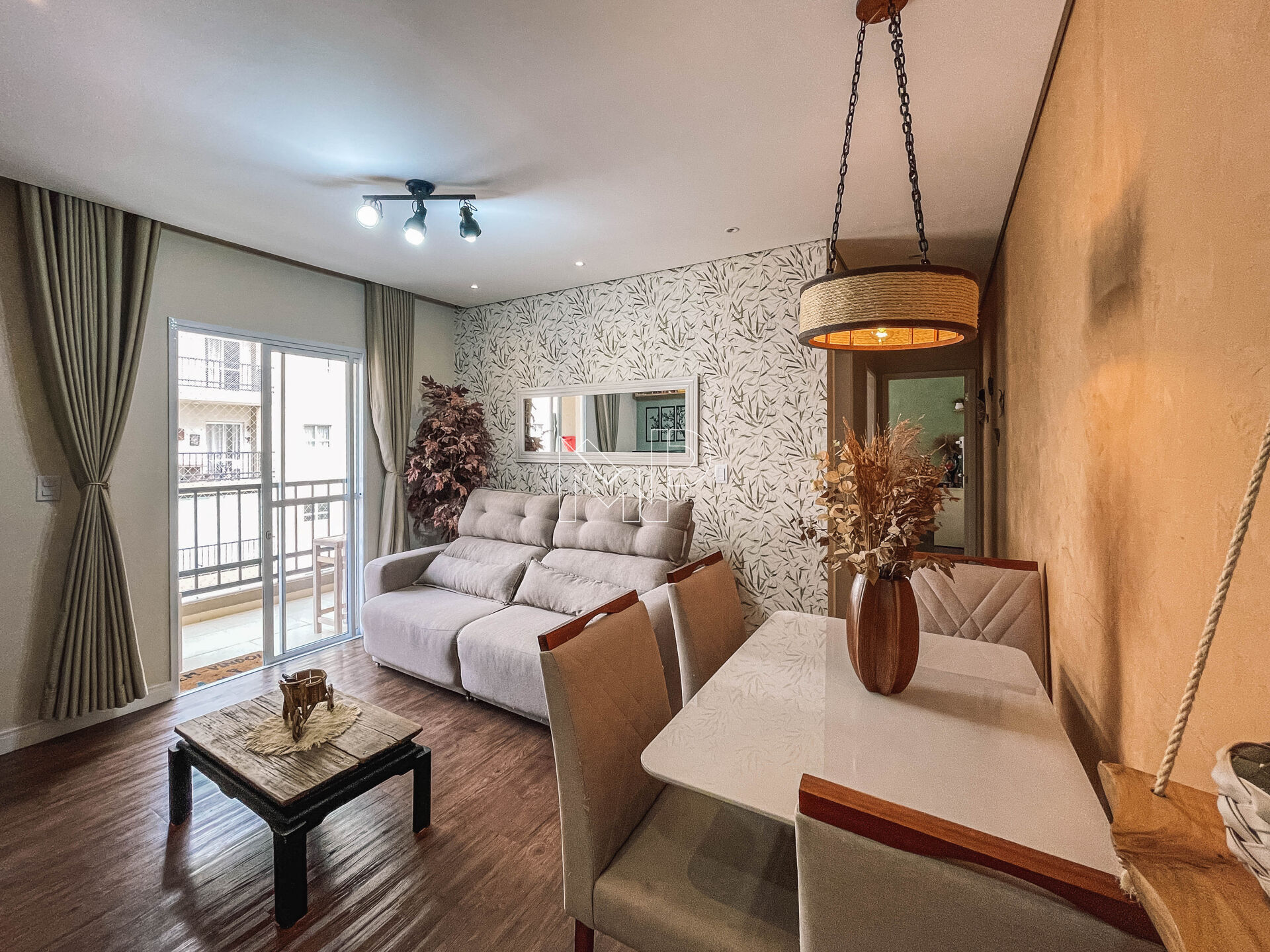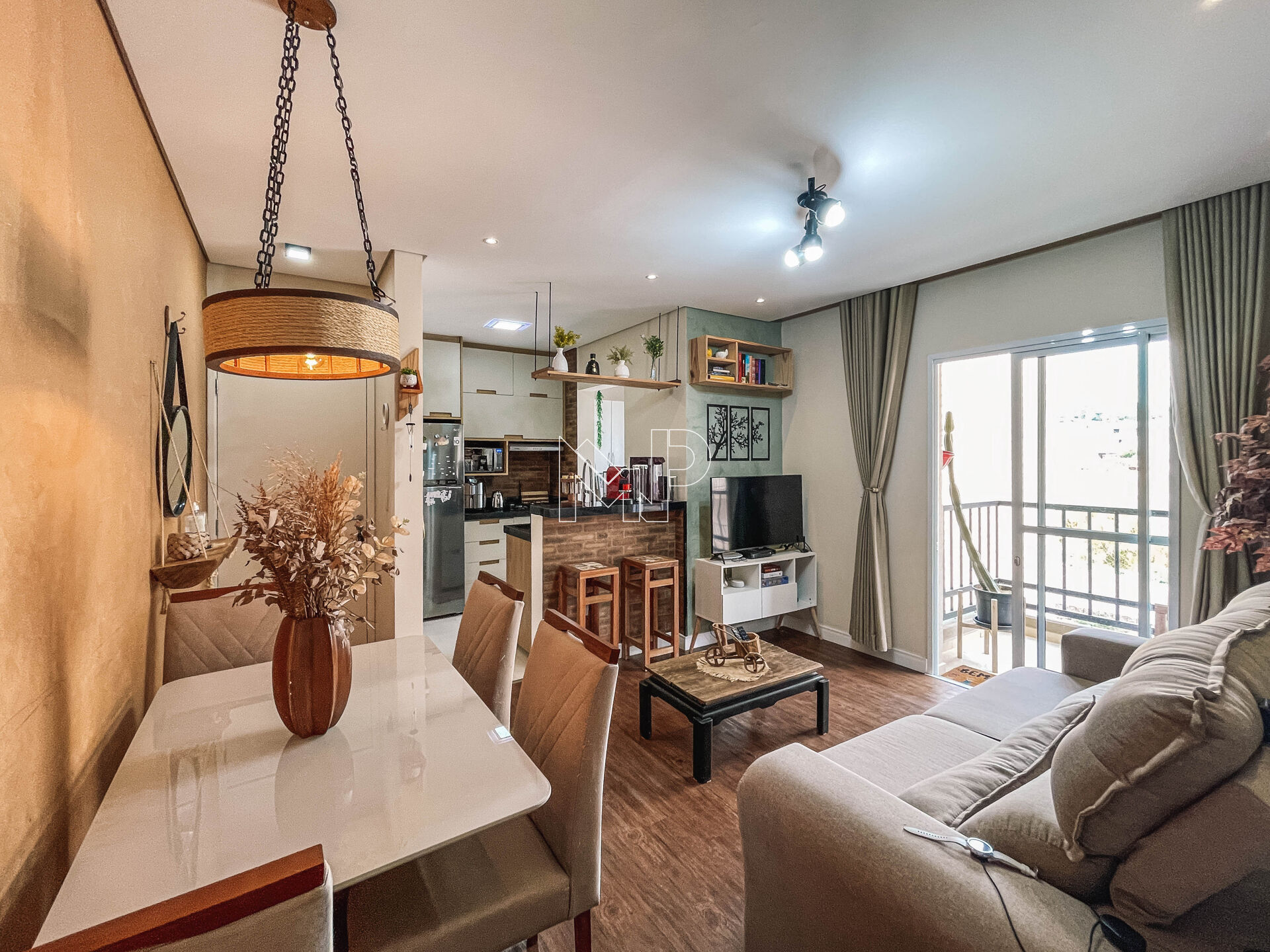 Apartamento com uma cozinha planejada, 2 dormitórios, vaga coberta e uma varanda bem espaçosa.