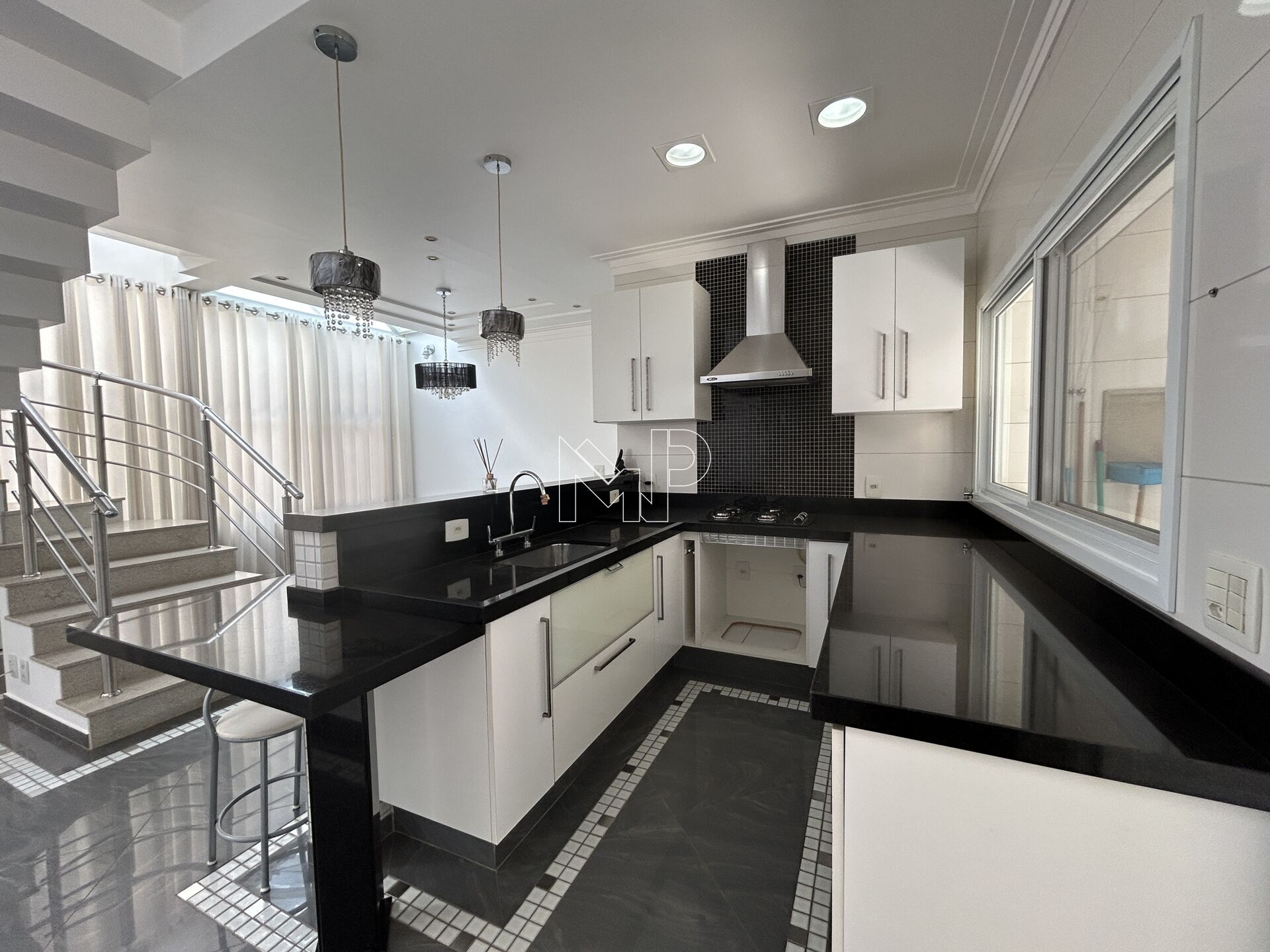 -sala e cozinha em ambientes integrados, armários planejados, com cooktop e coifa;