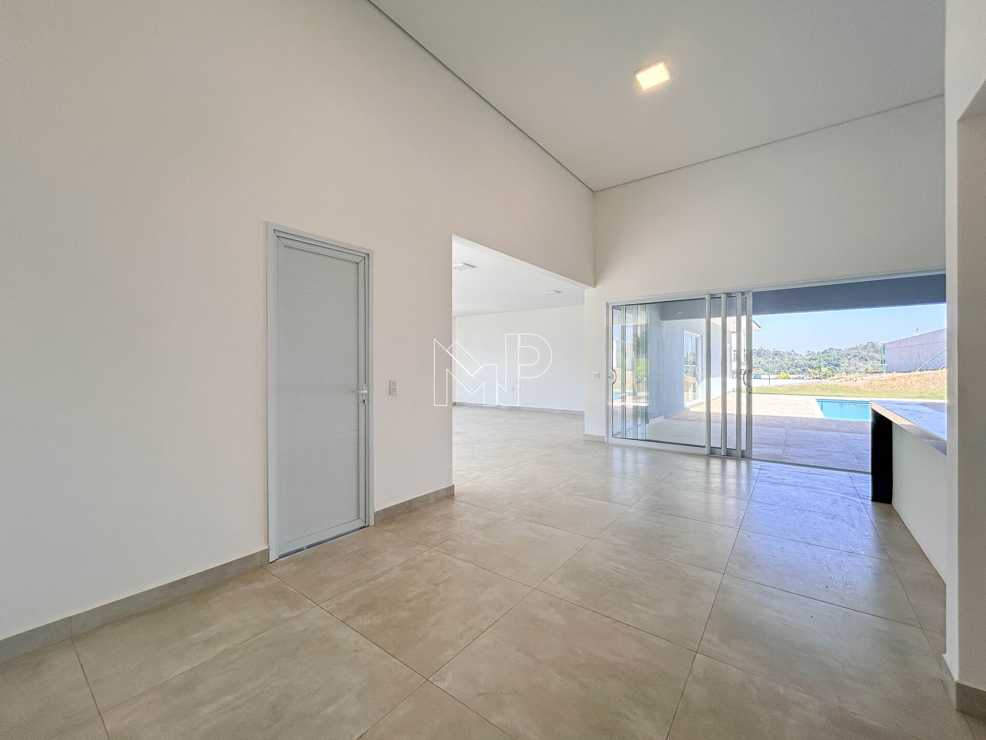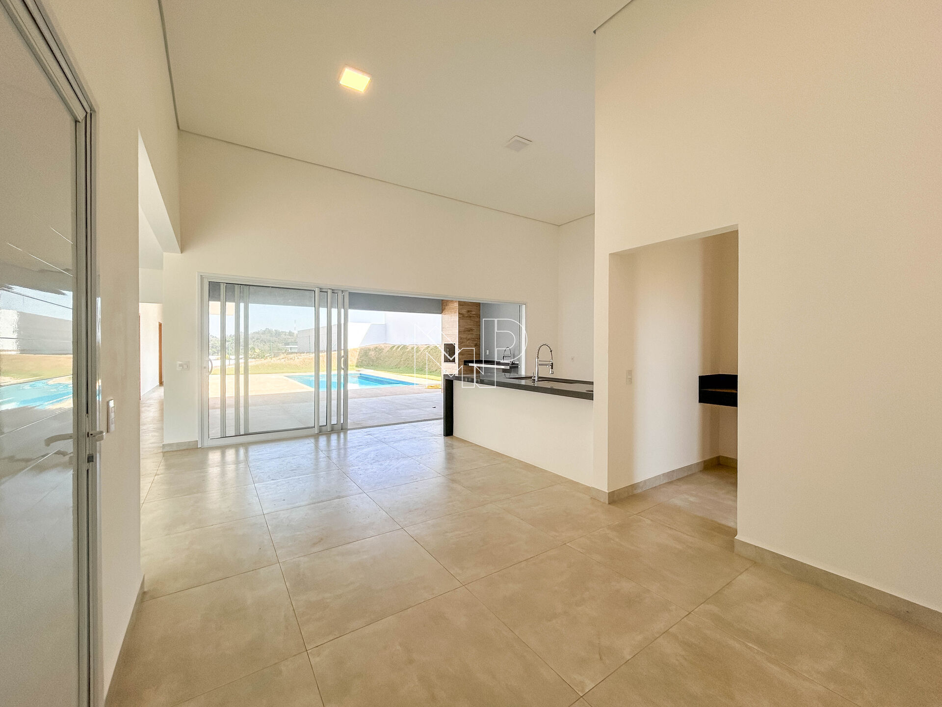 ☑️ Cozinha com península integrada com sala de jantar e espaço gourmet amplo que possui churrasqueira e pia;
