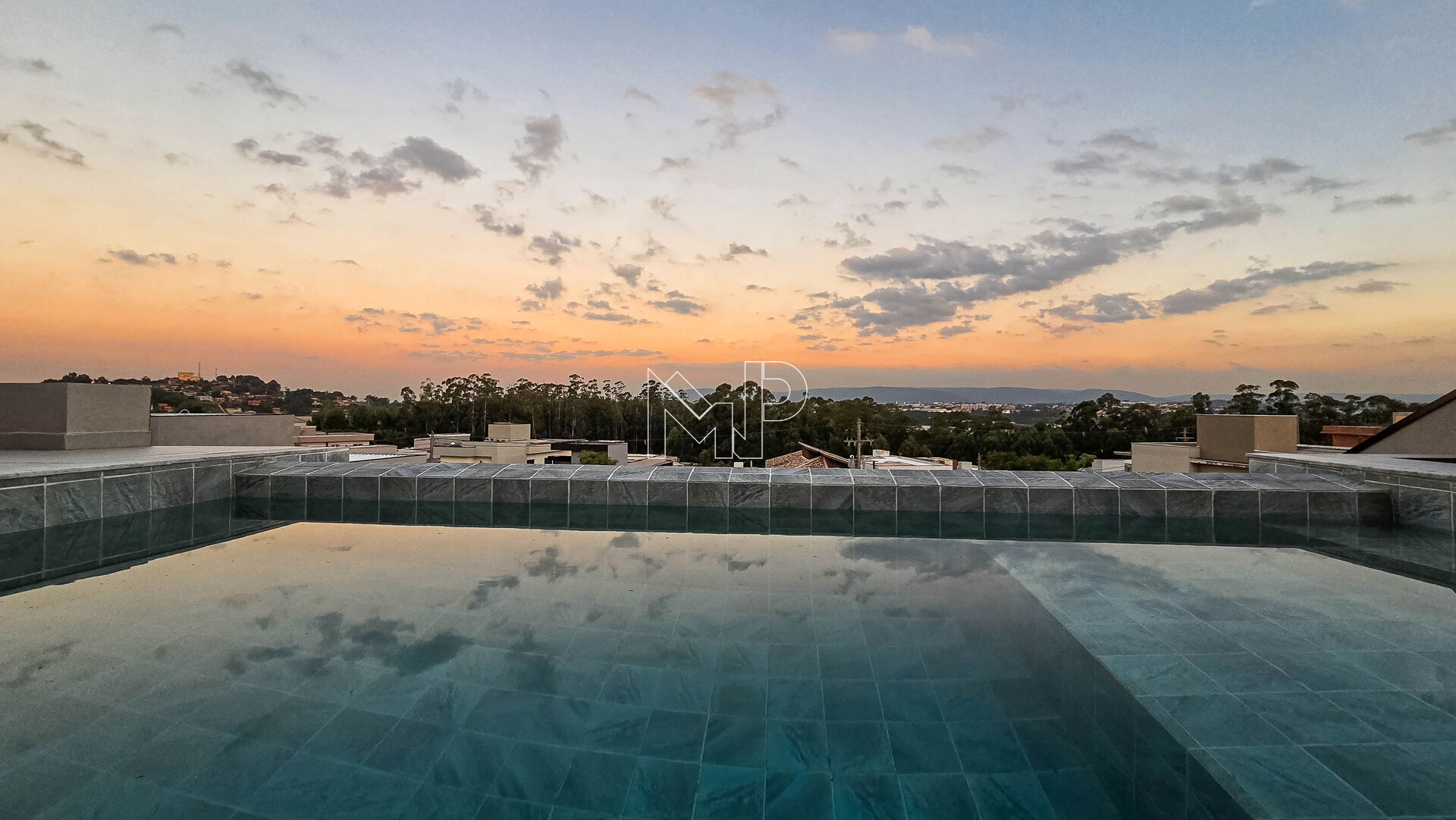 A residência conta com uma piscina de borda infinita.