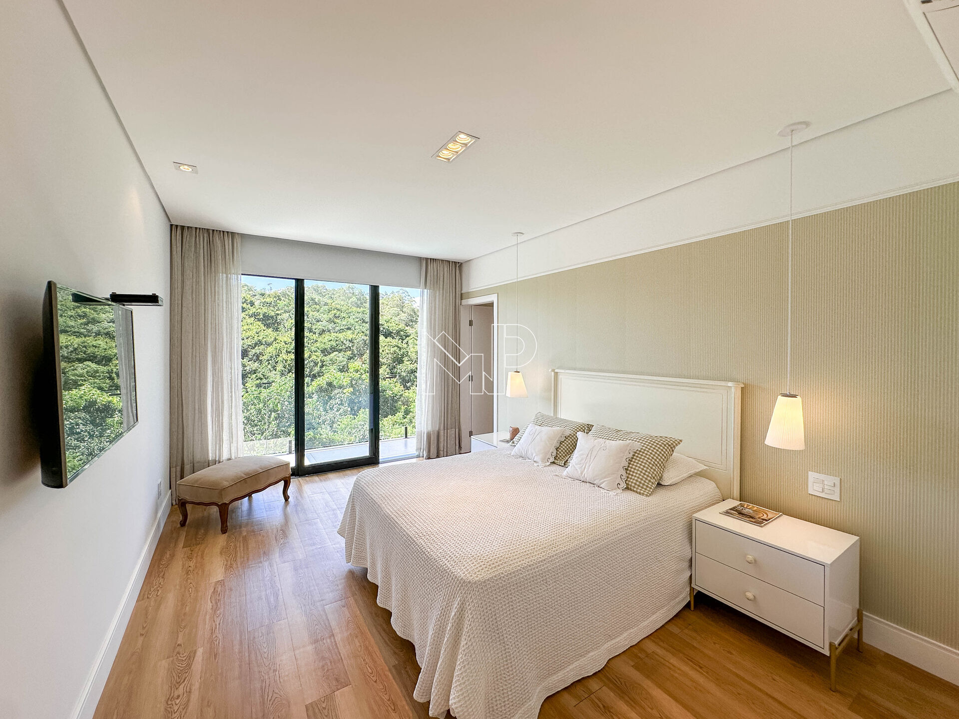 4 suítes, sendo 1 suíte master com closet e varanda com vista para a mata + 2 suítes com varanda compartilhada + 1 suíte padrão