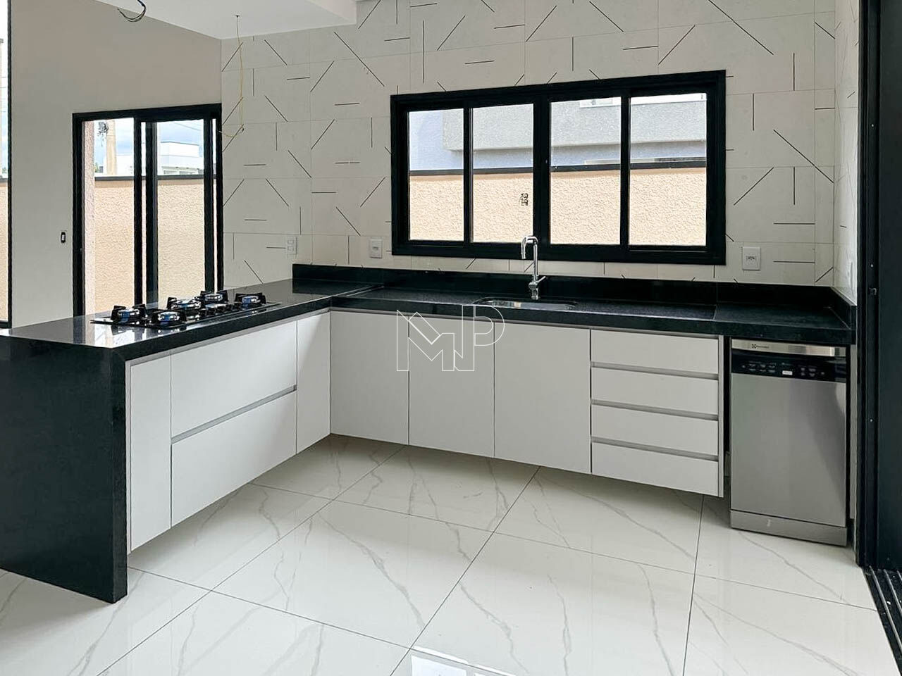 Casa térrea, com 3 suítes, sendo 1 suíte equipada com planejados, cozinha completa integrada com sala de jantar e sala de estar, pé direito alto, banheiros com armários e área gourmet.