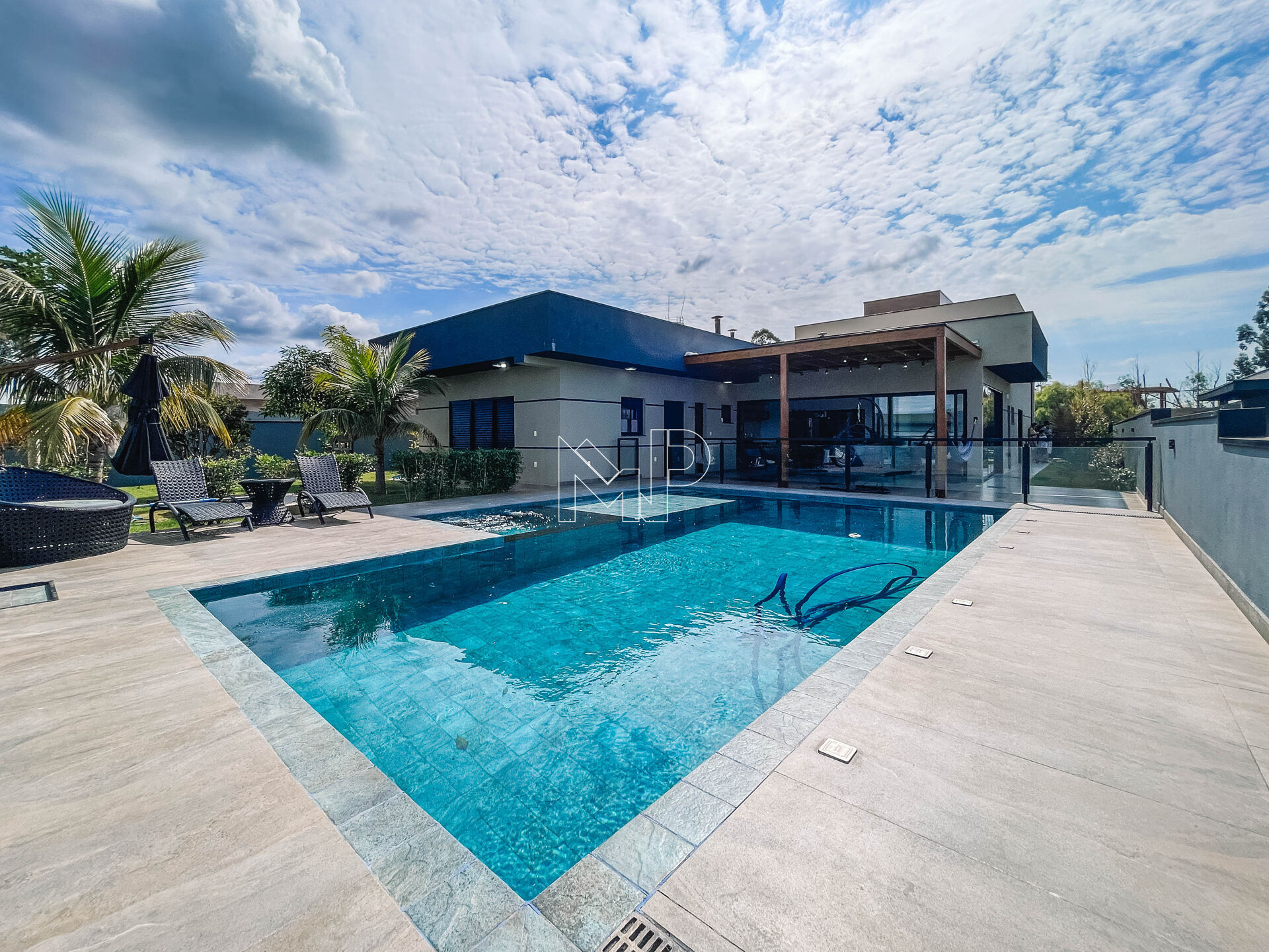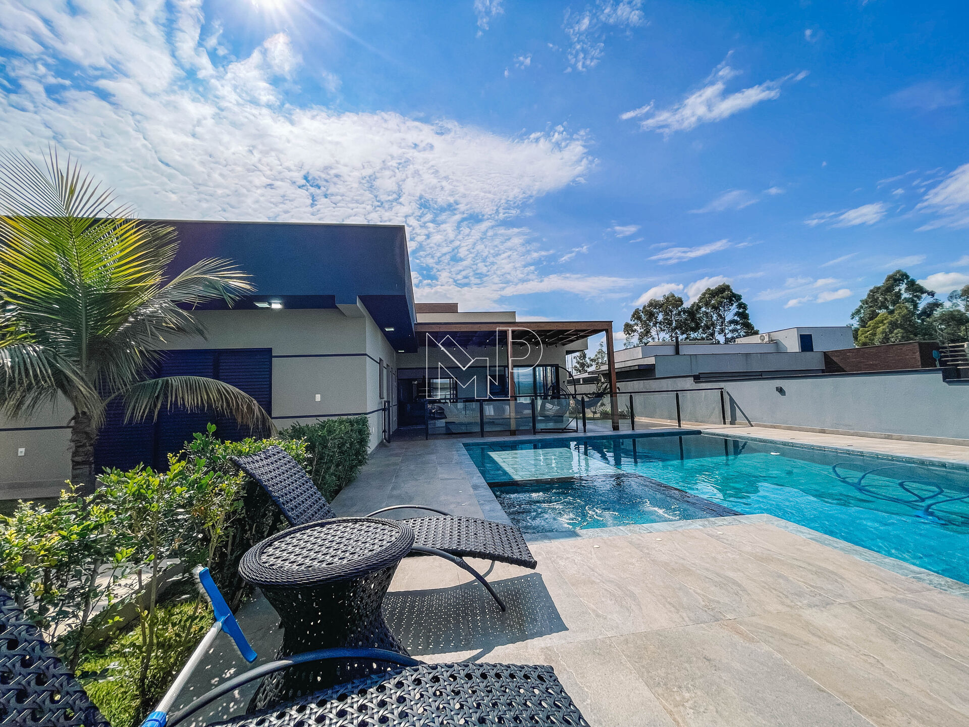 * Ampla piscina de 60.000 lts com vista permanente para a Serra do Japi, com ofurô integrado e hidromassagem, deck molhado e iluminação interna.